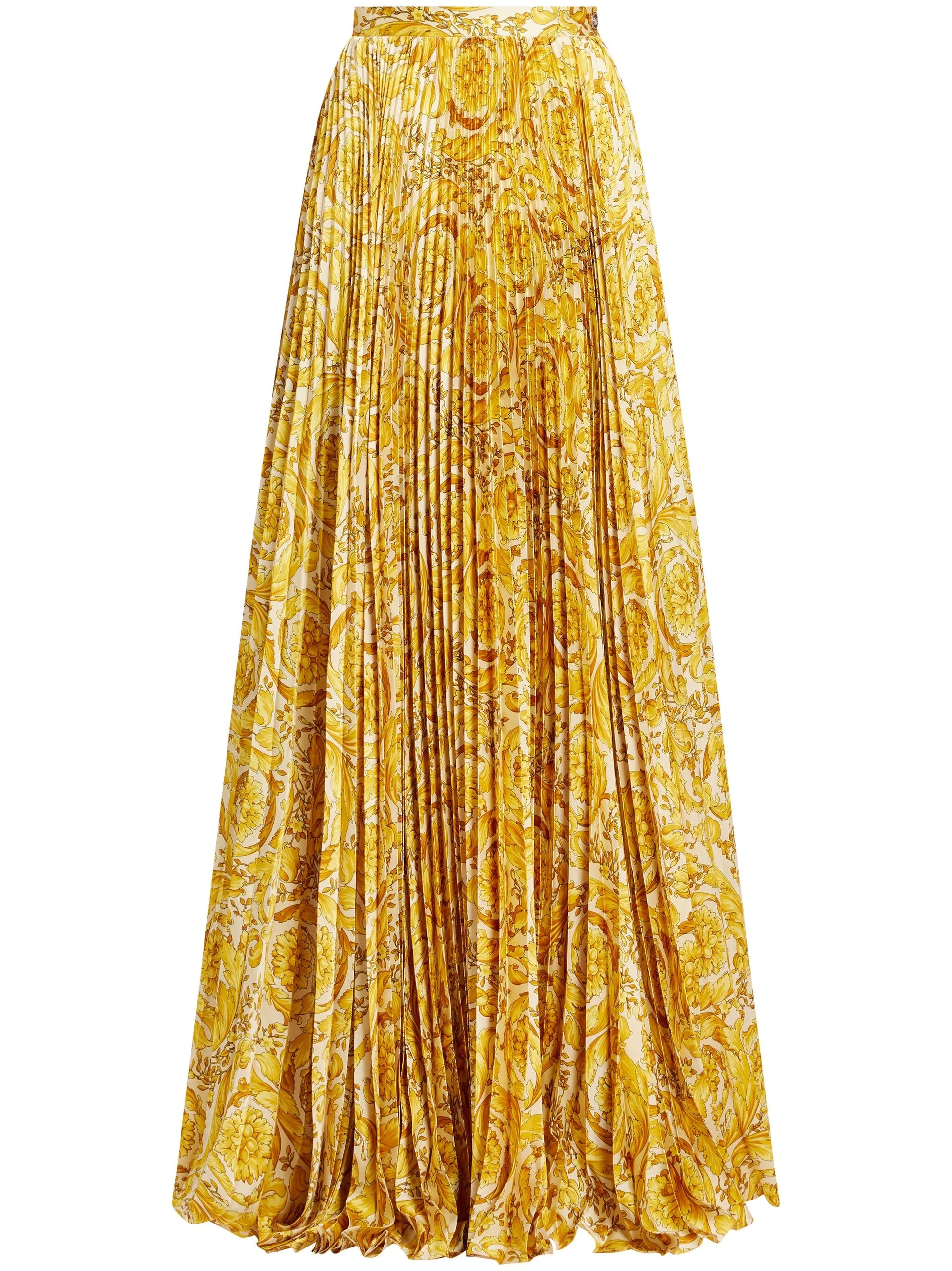 Versace channels regal flair with this ochre-yellow skirt. Crafted from lustrous satin to a pleated, floor-sweeping silhouette, it is saturated with the maison's signature Barocco print, spotlighting intricate flourishes.