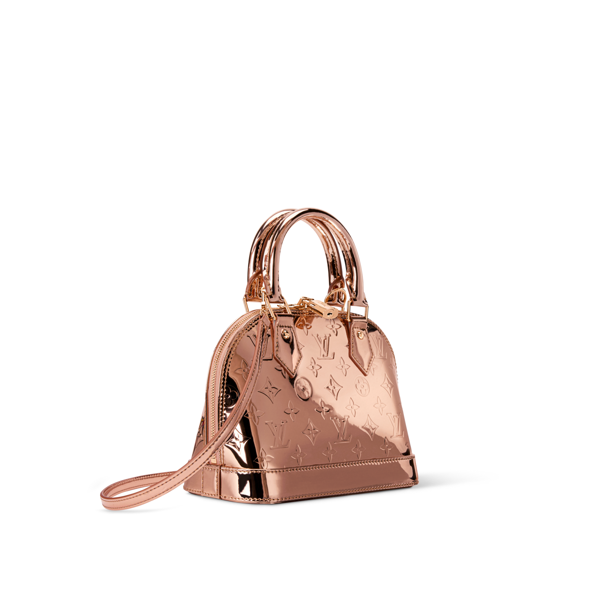 The LV Ski collection introduces technical details this season, and the Alma BB is a shining example with its light-reflecting Monogram Miroir finish. Bringing a retro-futuristic attitude to any look, it is crafted from weather-resistant canvas in a unique and exclusive Copper colorway with rose gold-toned hardware. It is decorated with a signature LV padlock, and includes a removable shoulder strap.